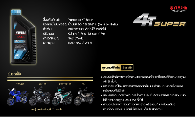 สำหรับน้ำมันใหม่ ตัวที่สอง คือ “4T Super” น้ำมันเครื่องกึ่งสังเคราะห์ ค่าความหนืด 10W-40 (Semi-Synthetic) สำหรับรถจักรยานยนต์ 4 จังหวะที่ใช้งานทั่วไป มาพร้อมกับความคุ้มค่าในเรื่องของราคา พร้อมกับเทคโลยีพิเศษ ที่ให้การปกป้องและหล่อลื่นเครื่องยนต์ มากกว่าน้ำมันเครื่องในมาตฐานชนิดเดียวกัน นอกจากนี้ ยังมีการเติม สาร additive ที่ให้ค่า ฟอสฟอรัสต่ำ” ช่วยทำให้เครื่องยนต์สะอาดมากยิ่งขึ้น และส่งผลให้มีการปล่อยค่าไอเสียที่ต่ำ ทำให้เป็นมิตรต่อสิ่งแวดล้อมมากยิ่งขึ้น