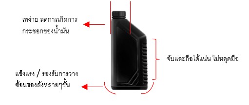 • - ปากของฝาขวด (เมื่อมองจากด้านหน้าจะอยู่ชิดทางด้านซ้ายมือ): ออกแบบให้เทง่าย ลดการหกของน้ำมัน